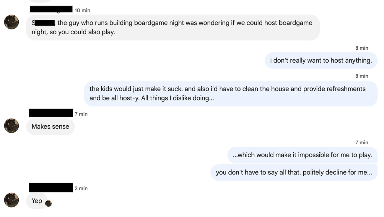 Example: The person who hosts board game night in my building asked my partner if WE could host it instead, the reasoning being that *I’d* also be able to join. (I usually stay back with the kids while my partner enjoys).
