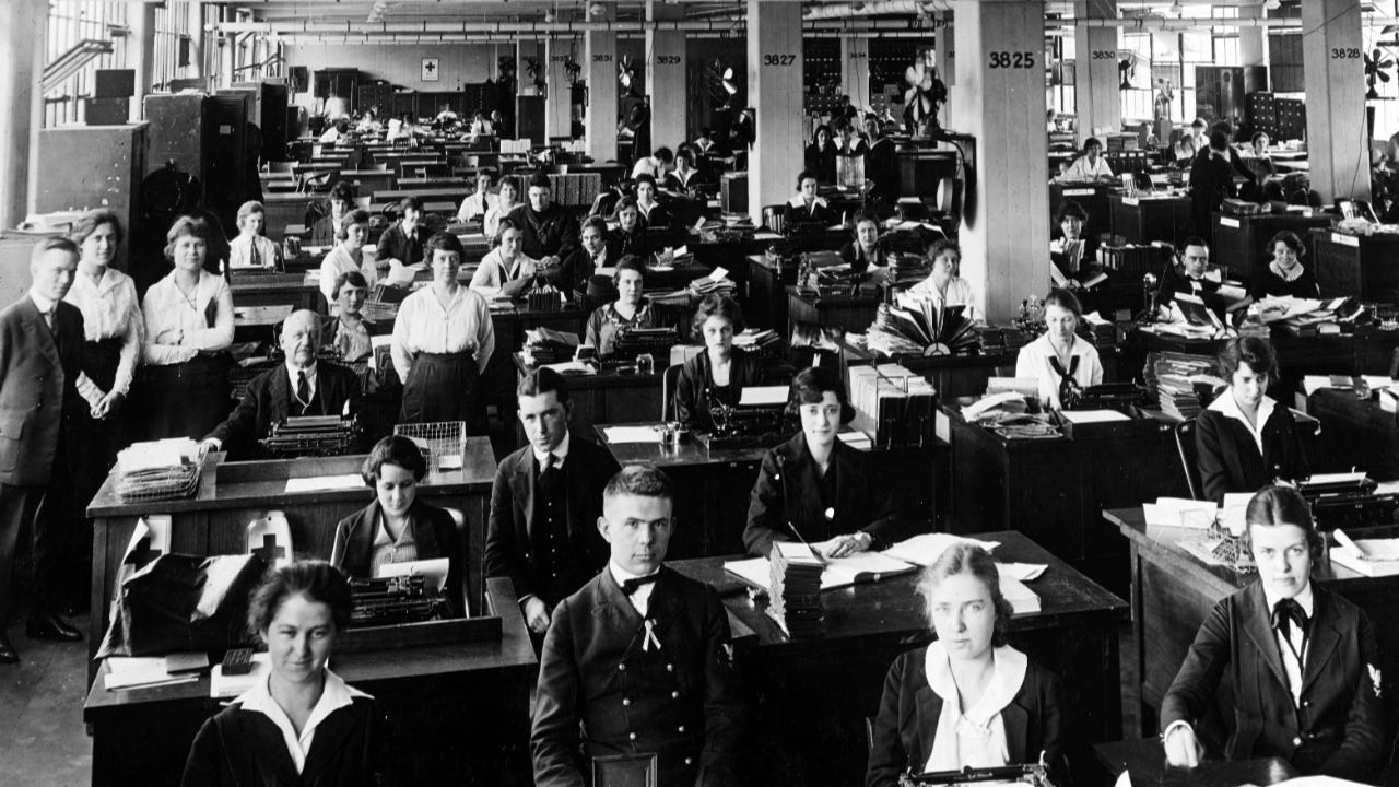 Well, that’s where a typing pool came in - it was a large, centralized group of typists who were responsible for producing ALL the typed documents for an organization. Managers, lawyers, or engineers would create documents by hand and dictate them onto shorthand notes or audio tapes, which they then handed to the typing pool to complete.
