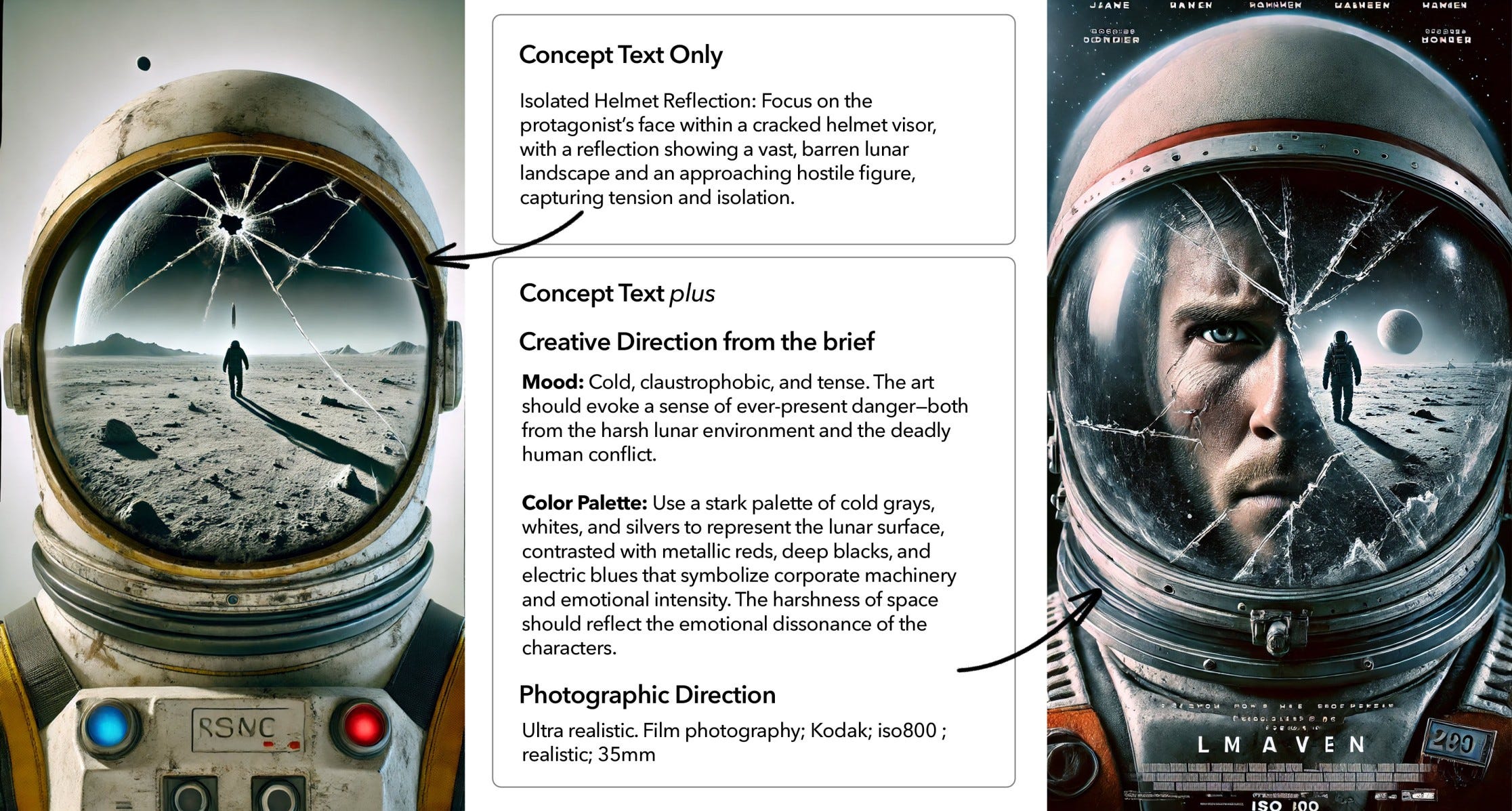 For example, if I feed ChatGPT a text description of a scene on its own, there isn’t any context on style, color palette or lighting for the AI to work with, and what you get back may not feel correct to the idea you had in your head.