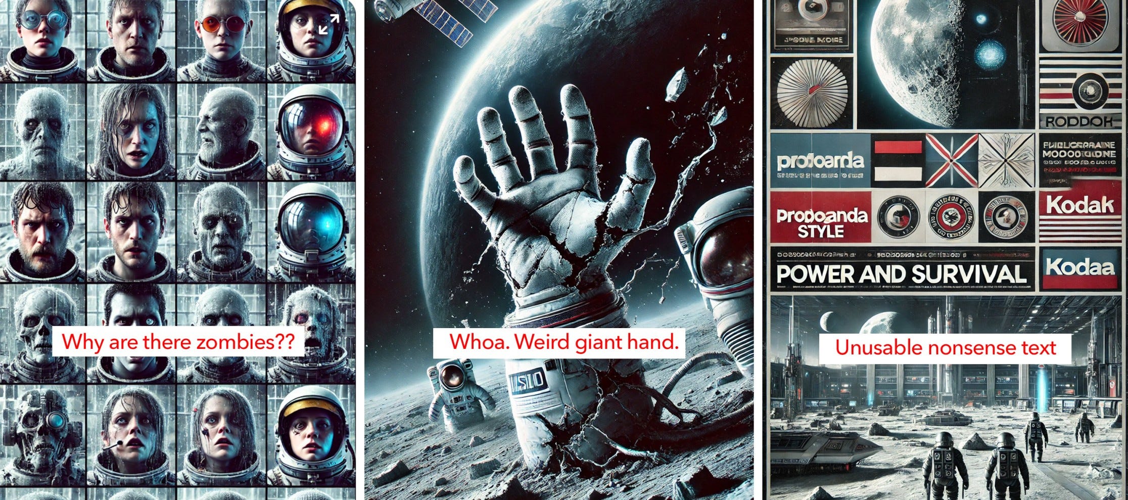 Challenges: It kept putting weird text on the images even though I specifically asked it not to. Also, I am finding with DALL-E 3 that the image was often regenerated completely when I was only trying to make a revision. Someone give me a shout if there's a better way to do it, but that's what kept happening for me. Also, there was plenty of "uncanny valley" stuff here too, just like with Midjourney. See below.