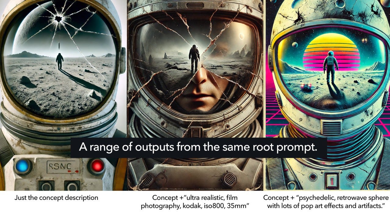 So you have to add specificity around style, color palette — and if it’s meant to be realistic — even camera direction like film type, lens, and lighting. See below for an illustration of this.