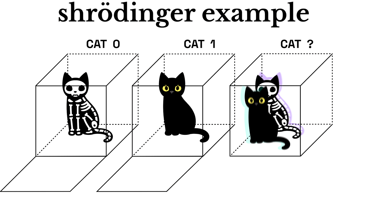 I made you a drawing to illustrate the Shrödinger paradigm. For this article, please note that I’ve shifted the analogy: the “skeleton kitty” isn’t dead, but is simply wearing a Halloween costume. No real or theoretical cats were harmed in the making of this illustration series ;)