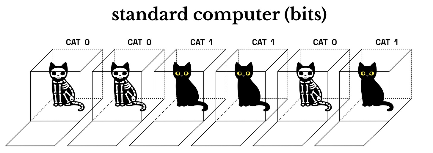 In contrast, the most basic unit of information in a quantum computer is called a qubit. A qubit can be either 0, 1 - or in a superposition state of both simultaneously! (Hot dog!…I mean cat.) A quantum computer uses superconducting circuits, trapped ions, or other systems which often need to be cooled to close to absolute zero to maintain quantum states.