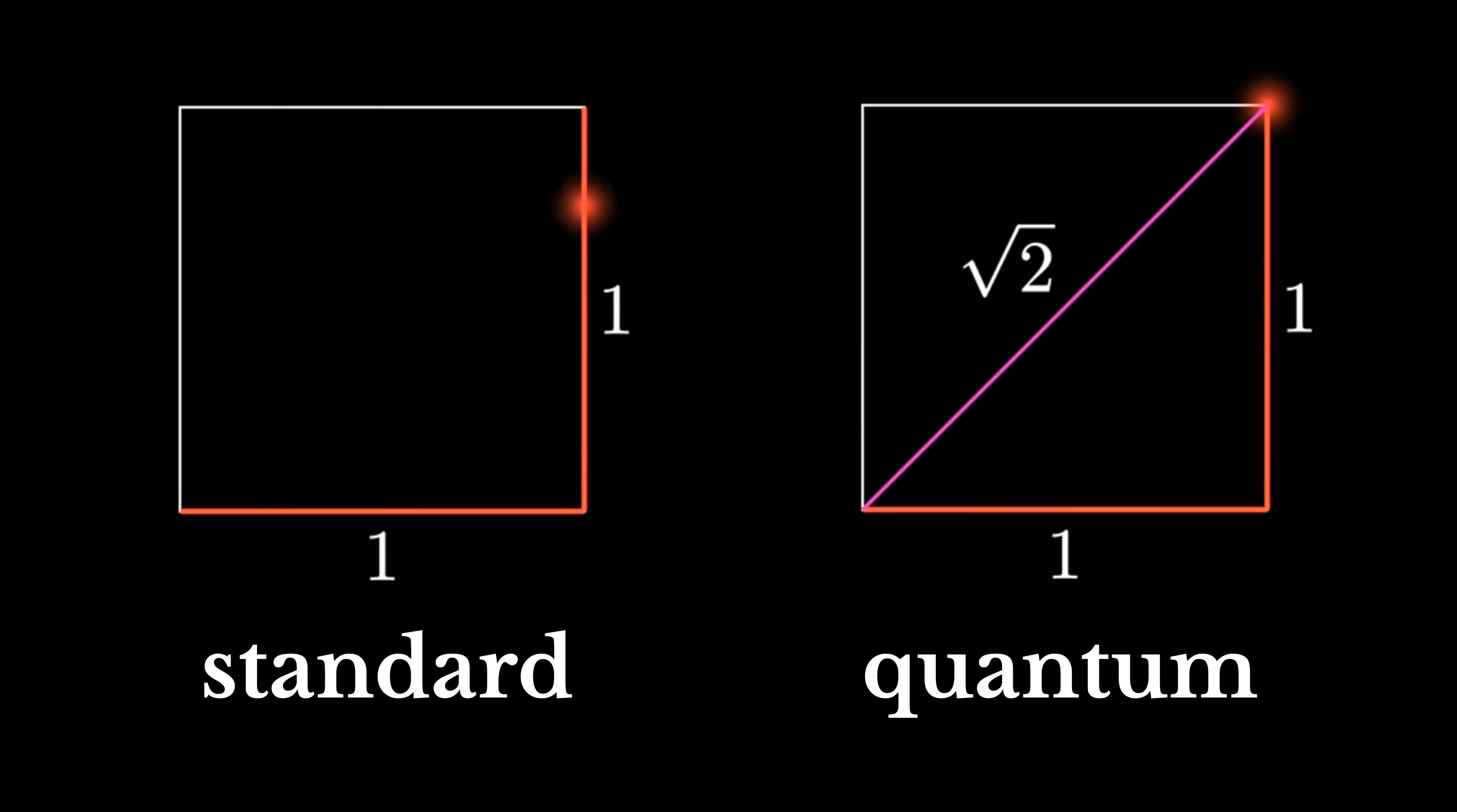 We’re back at last to the question that started this: why do we care about qubits and quantum computers? Well, they have the potentially to enormously speed up calculations of REALLY difficult problems - things that would take a standard computers years to complete, if at all. Don’t get TOO excited - it doesn’t actually make sense to use a quantum computer for most of the tasks you’re doing on a typical basis. But, let’s try to qualify (in a really simple way) WHY there’s a speed up at all. Rather than thinking of it as being an advantage of parallel processing, it’s more about the fact that you can save time if you aren’t limited to having to explore one option at a time. For example, if you’re trying to traverse a 1x1m square and you are limited to walk only perpendicular routes, the distance to your destination will be 2m. But if you can walk diagonally, you can get there in √2m. 3Blue1Brown’s video summarizes it visually like this, which is super helpful: